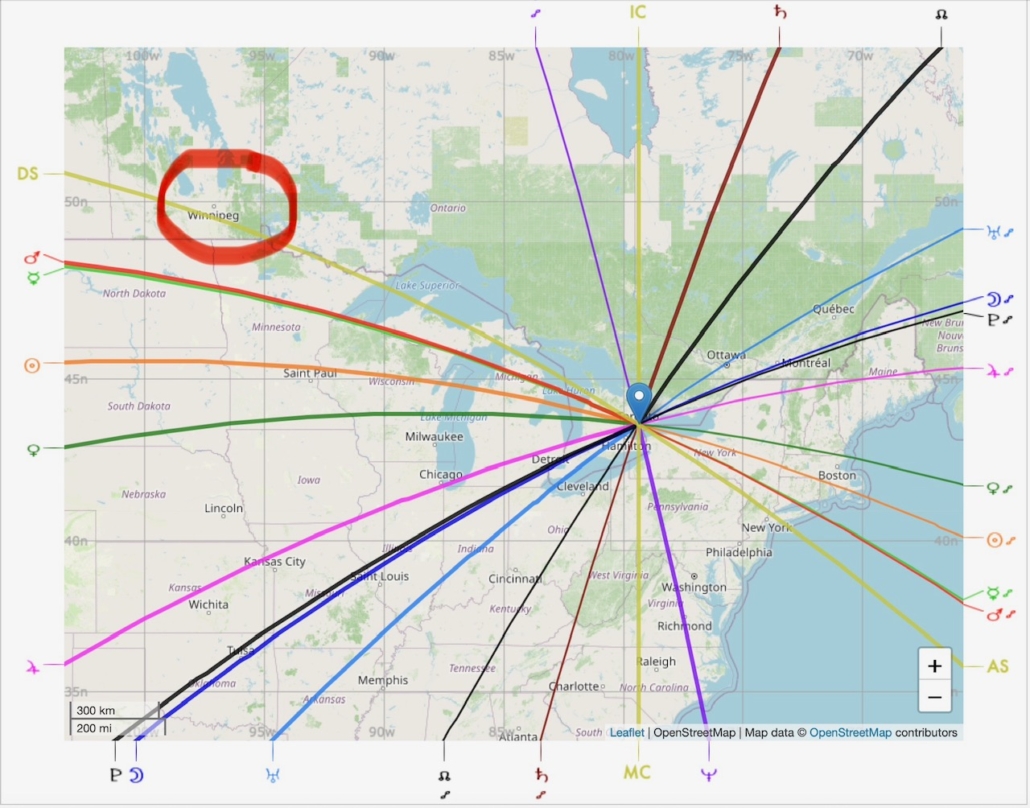 Curious as always, I gave it a try. I created a profile, entered my birth data—and within seconds, a map appeared. Lines stretching across the world, starting in Toronto and branching out like a firework.